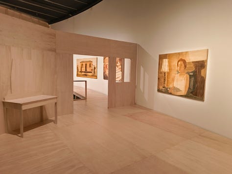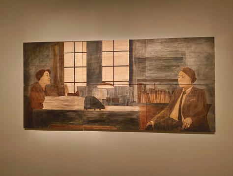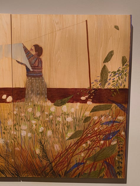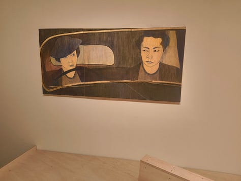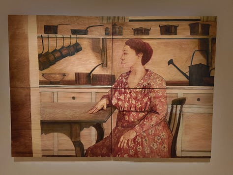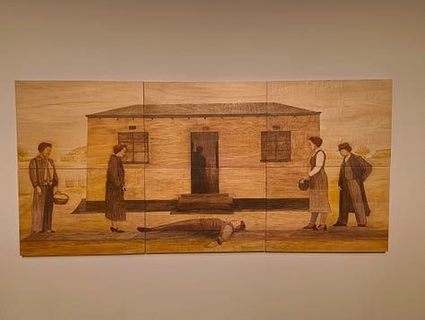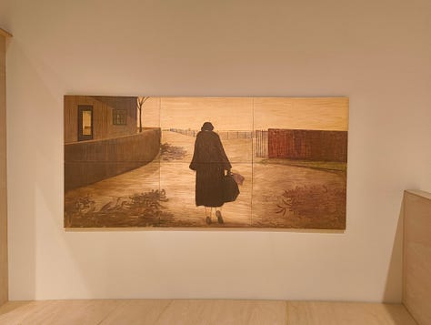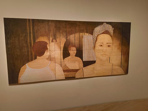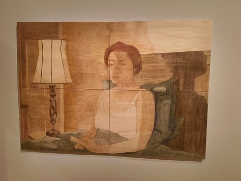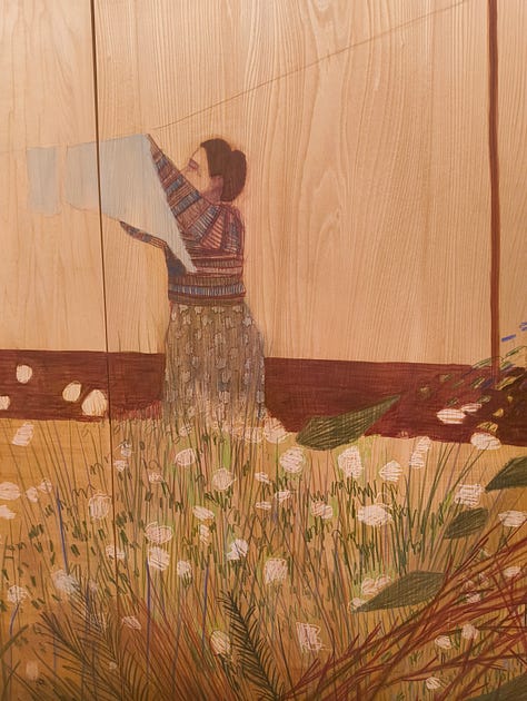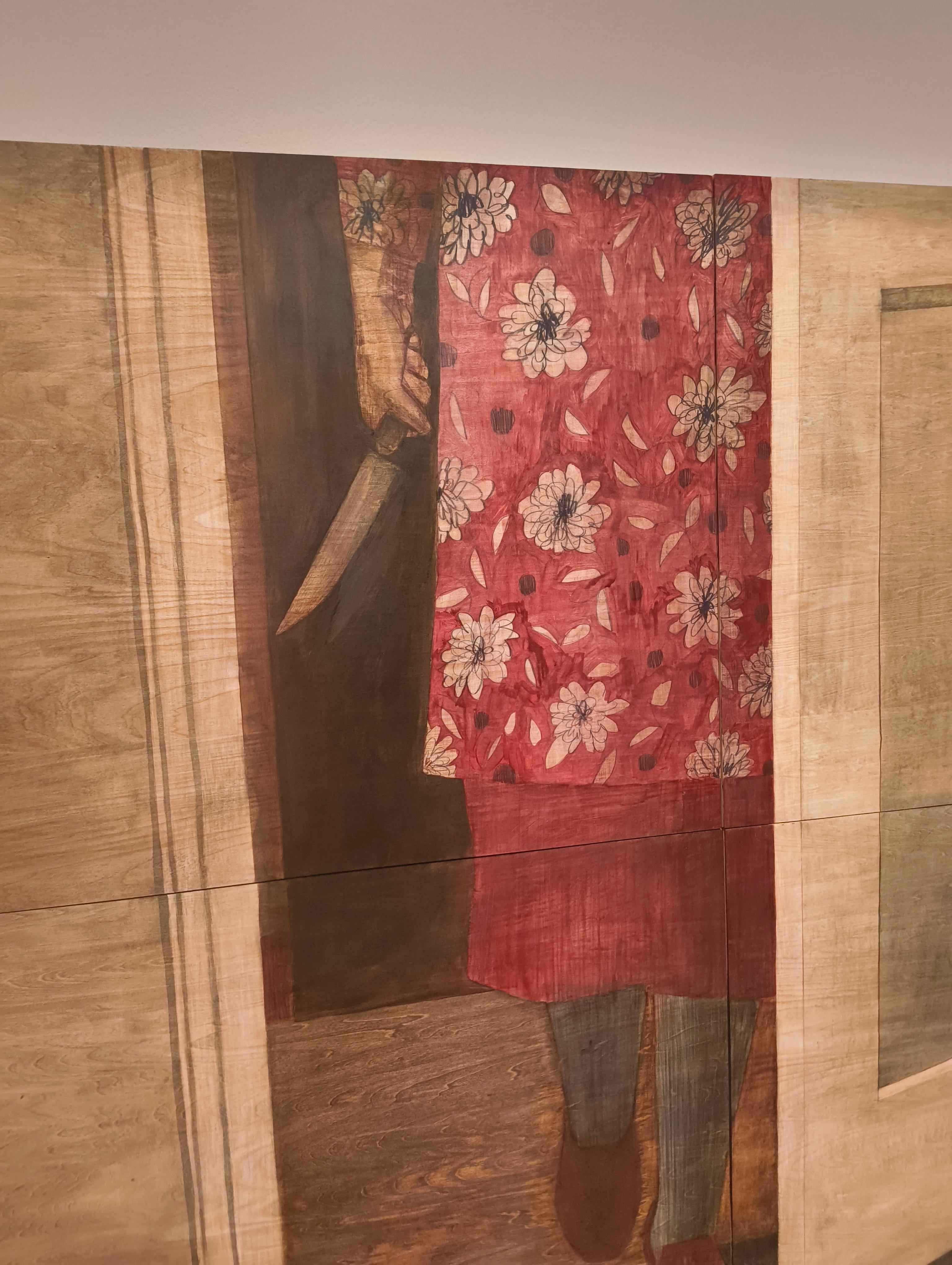 Sunstrum’s woman, her women, are at the heart of the narrative, in the quiet potency of shared glances, in the privacy and imprisonment of domestic spaces, in the cigarettes shared and solo, in the tea towels drying cups, in the kitchen knife in the hand. And throughout, the grain of the wood peeks through, both present and absent.