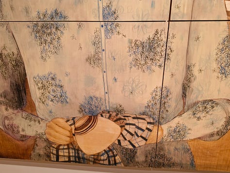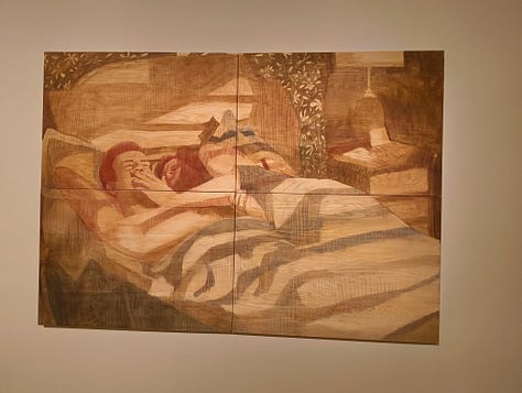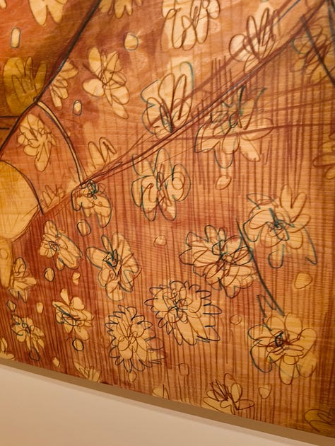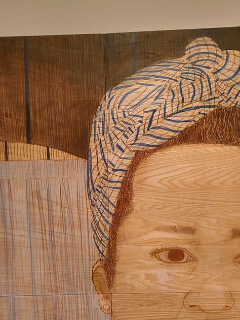 Painting onto wood is a vibe. People didn’t really paint on canvas until around the 16th century – all of Hieronymus (or Jérôme, as the French call him) Bosch’s works are generally oil on oak, the same for Hans Memling’s ‘Last Judgement’ (one of my faves), while Cranach (the elder) often painted on beech. But it’s not often that you see a contemporary show as committed to reengaging with the practice as this.