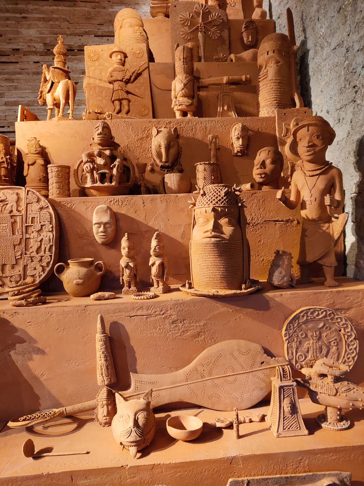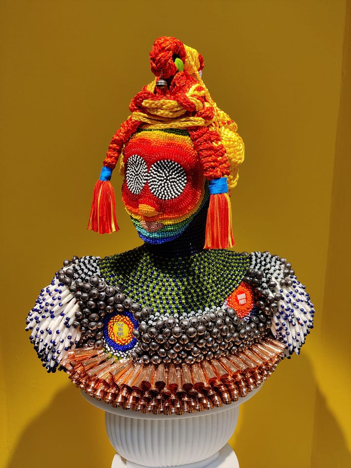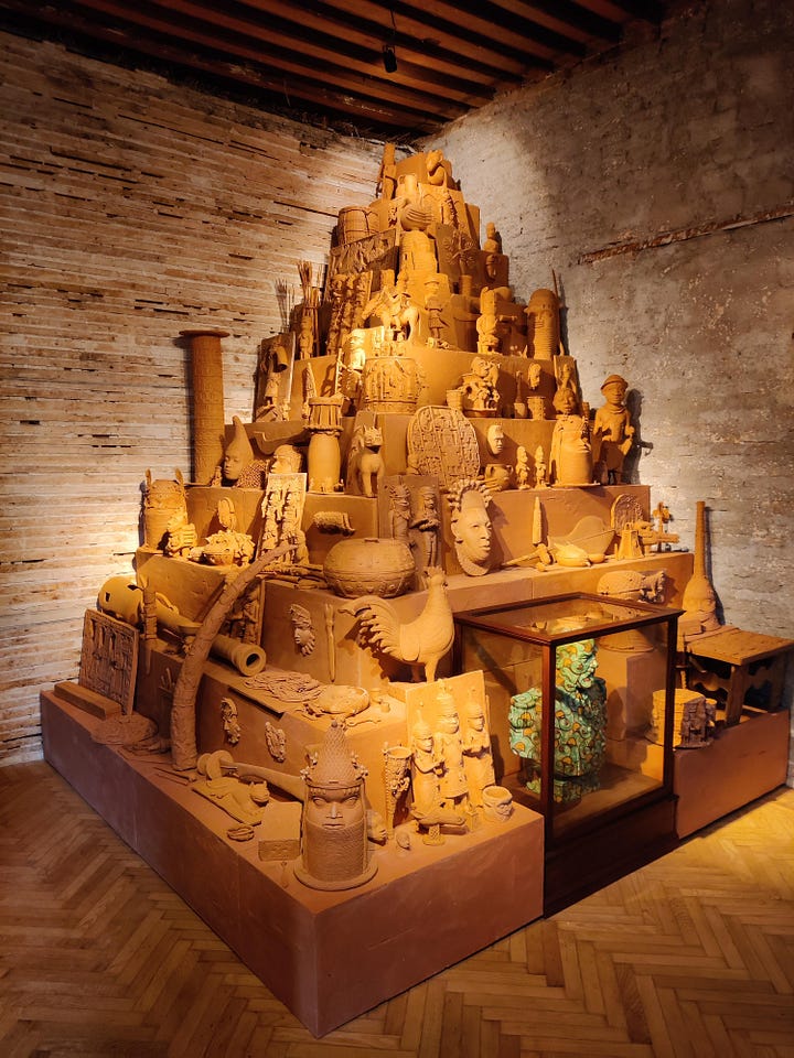 Curator Aindrea Emelife has woven a bold range of diverse Nigerian artistic voices into a klaxon chorus from the diaspora. Off-site at the Palazzo Canalin on the Dorsoduro, there’s a warm energy to the space, which hosts a bright ceiling painting by Tunji Adeniyi-Jones, a dark monument to state violence by Ndidi Dike, a radio tower garden installation by Precious Okoyomon, and more. The real highlight here is Yinka Shonibare’s works crafted from clay, which replicate 150 objects looted from Benin City in 1897 by the British.