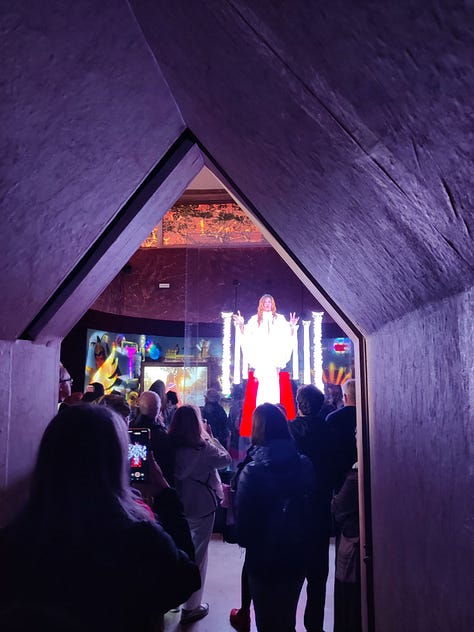 This was really good. An installation of sound and light work in combination with colourful mixed media sculptures. It does what it says on the (slightly oxymoronic) tin - if you like techno and you like zen, then you’ll probably enjoy Nemes’s work. There’s lots of colour and mesmeric sound that drags you somewhere between a meditation and a rave. I saw a bit of dancing, I saw chilling, I saw flashing lights, and I loved the central open space which melds all the elements together.