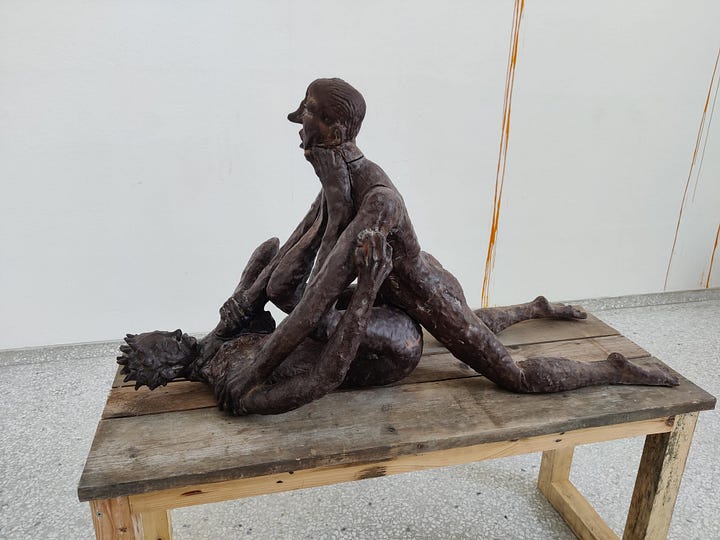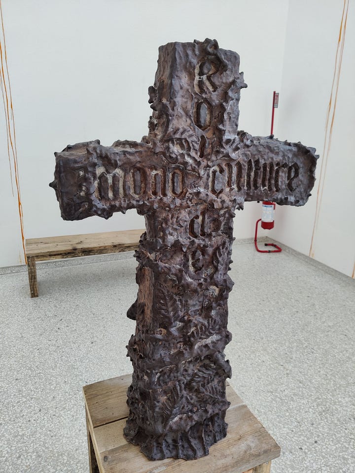 Brutal and eerily beautiful. The internal walls and external signage of the pavilion are dripping with yellowy/orange paint, like traces of something yucky. This is the work of artist Renzo Martens, curator Hicham Khalidi and the Cercle d’Art des Travailleurs de Plantation Congolaise (CATPC), an artists’ collective of Congolese plantation workers. The pieces they have created within the space reference an ancestral sculpture named Balot taken from Congo and loaned back for the duration of the Biennale by the Virginia Museum of Fine Arts. The works are wrought in darkness and light, with one functioning as a particularly horrifying depiction of literal colonial rape. It’s a heavy but necessary stop on the tour.